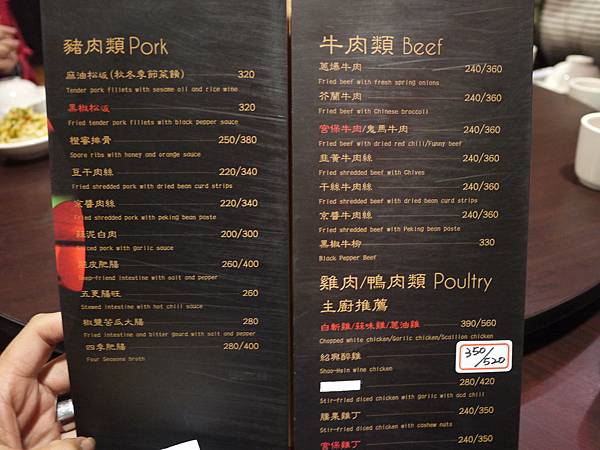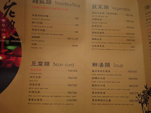 老食人的菜單內偏中式料理~混有客家,台式風味,大部份菜色都有小/大份可以選擇